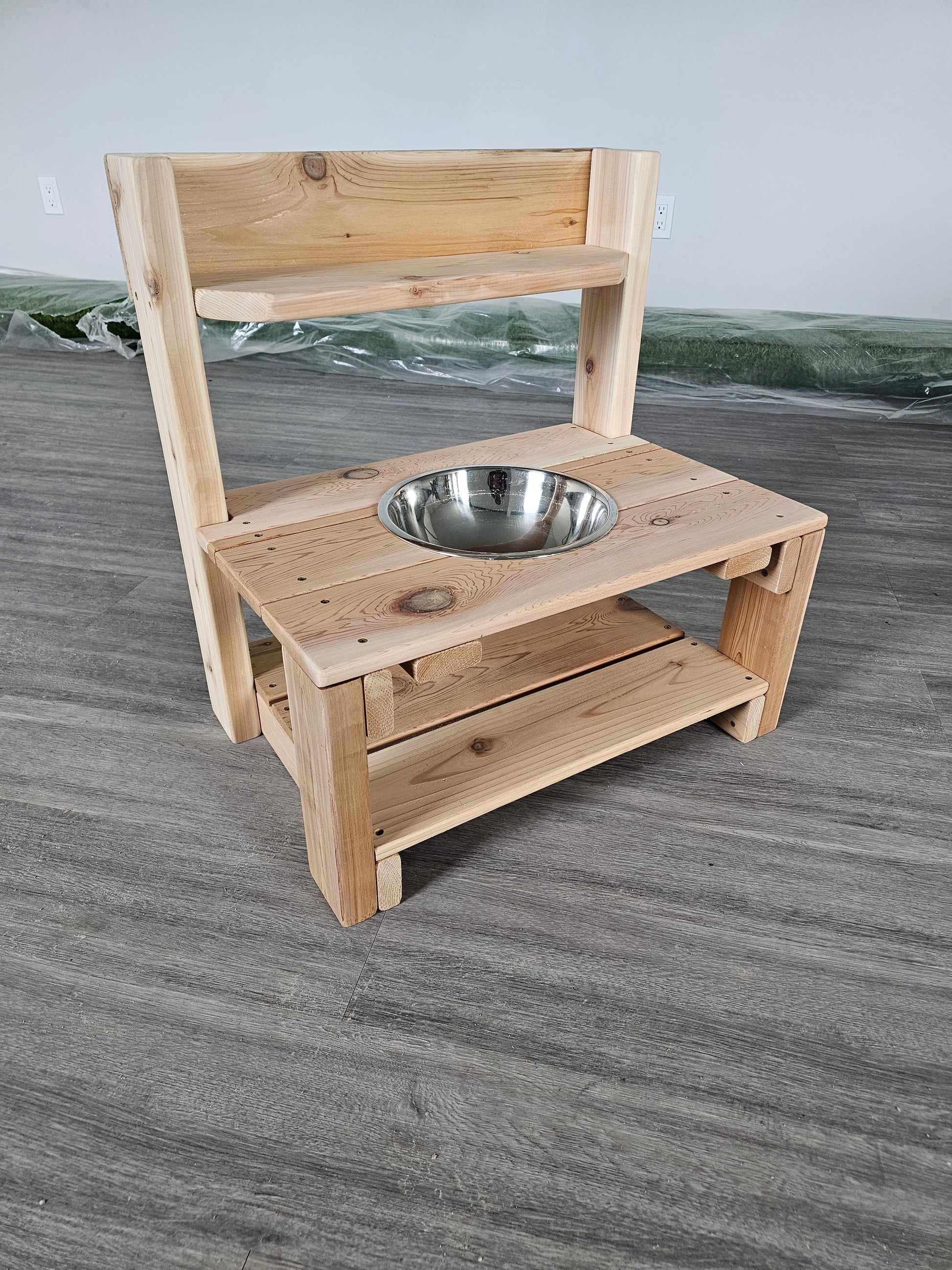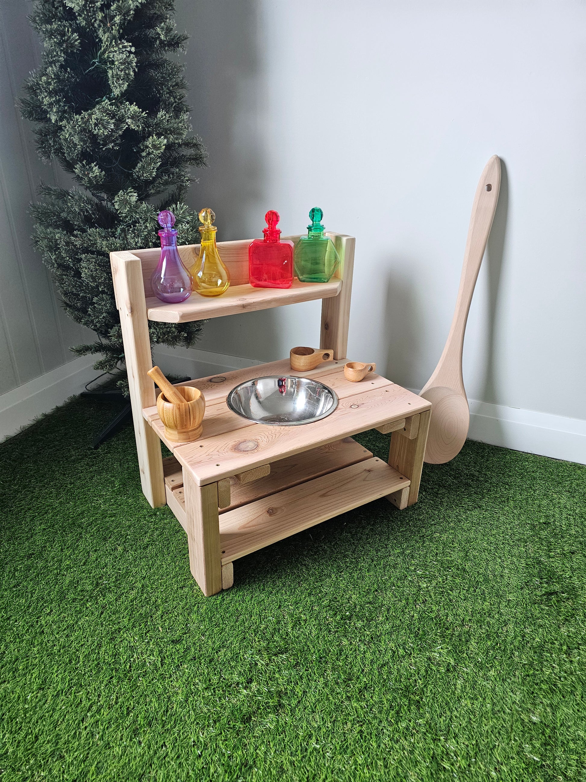 Bring the joy of messy play to smaller spaces with the Mini Mud Kitchen—a compact, thoughtfully designed unit perfect for one or two young explorers. This handcrafted discovery center includes an integrated aluminum bowl and a lower shelf for storing tools, ingredients, or nature treasures. Ideal for outdoor classrooms, backyard play, or toddler learning zones, the Mini Mud Kitchen encourages hands-on sensory play and imaginative exploration.